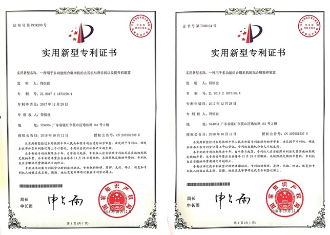 值得一提的是湛江市金順糧食機(jī)械制造有限公司通過(guò)iSo9001體系已獲得多個(gè)專(zhuān)利,其中有外觀專(zhuān)利(多功能碾米機(jī));實(shí)用專(zhuān)利(一種多功能組合碾米機(jī)、一種用于多功能組合碾米機(jī)的去石機(jī)與礱谷機(jī)以及提升機(jī)裝置、一種用于多功能組合碾米機(jī)的混合糠粉碎裝置、一種用于多功能組合碾米機(jī)的電控與風(fēng)機(jī)裝置、一種用于多功能組合碾米機(jī)的比重篩和碾米機(jī)裝置);發(fā)明專(zhuān)利(湛江碾米機(jī)、符氏ZJF-15-40M&S型號(hào)組合碾米機(jī))等。