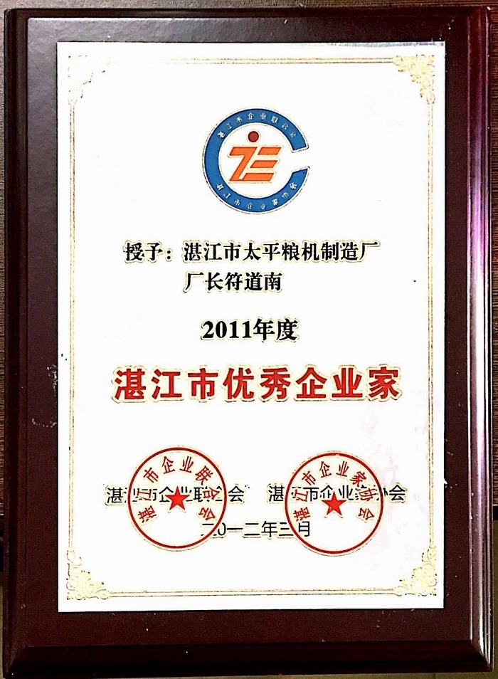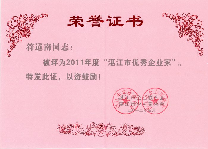 2011年度湛江市優(yōu)秀企業(yè)家榮譽證書2012年3月